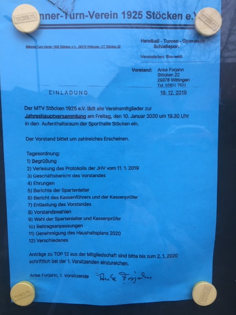 'Dorfkasten' 2020 Wanderfahrt in den Harz, am Samstag, 04. Juli. 2020, EINLADUNG hier... Fasching, am Samstag und Sonntag, 22. und 23. Febr. 2020, EINLADUNG hier... MTV Stöcken - Jahresversammlung, am Freitag, 10. Jan. 2020, EINLADUNG hier... Informationen und Fotos zu neuen Ereignissen in 2020: Unser 'Storchennest auf dem Turm'; in der Dorfmitte Unser 'Eulenkasten im Turm'; in der Dorfmitte; Informationen und Fotos zu bisherigen Ereignissen in 2019: Einladung zur Weihnachtsfeier des MTV Stöcken; am Sonntag, 15. Dez. 2019 / ab 14:30 Uhr, Einladung hier... Dorfweihnachtsbaum aufstellen; am Freitag, 29. Nov. 2019 / ab 16:00 Uhr, Einladung hier... Herbstlaubaktion auf dem Friedhof; am Samstag, 16. Nov. 2019 / ab 9:00 Uhr, Einladung hier... Der Stöckener Laternenumzug 2019; am Freitag, 08. Nov. / Treffen um 17:30 Uhr am Spielplatz, Einladung hier... MTV-Wandertag am Sonntag, 27. Okt. 2019, Foto-Collage hier... Hofflohmarkt am Sonntag, 29. Sept. 2019, Foto-Collage hier... Alle ab 29. Sept. bis zum Jahresende noch offenen Termine in Stöcken: hier... Das Kinderhaus an der Ise, am Samstag, 28. 09. 2019 / ab 14:30 Uhr: , Dorffest Stöcken, am Samstag, 14. 09. 2019 / ab 15:00 Uhr, am Sportplatz: EINLADUNG hier..., Foto-Collage hier... Osterfeuerchen 2019 in Stöcken, am Oster-Sonntag, 21. April 2019 / ab 19:00 Uhr: EINLADUNG hier...
